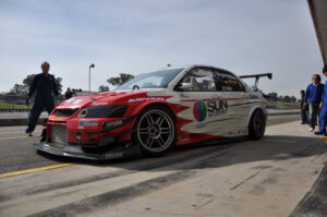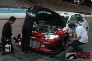 目先の課題はフロントダウンフォース。まずはC-WESTエアロに追加する形で、 HRSお手製の大型カナードと、新設計のボルテックス フロントアンダーパネルを導入。 VOLTEXエアロの威力は絶大。2003年3月、新たな武器を手に入れたサイバーエボ号は 筑波56秒588を叩き出しベスト更新。しかしライバルのJUNオート ランエボ5は55秒976で 筑波最速の称号はJUNオートの手に。